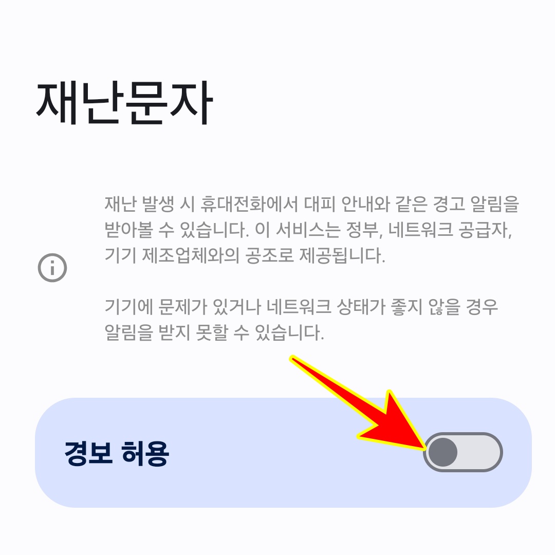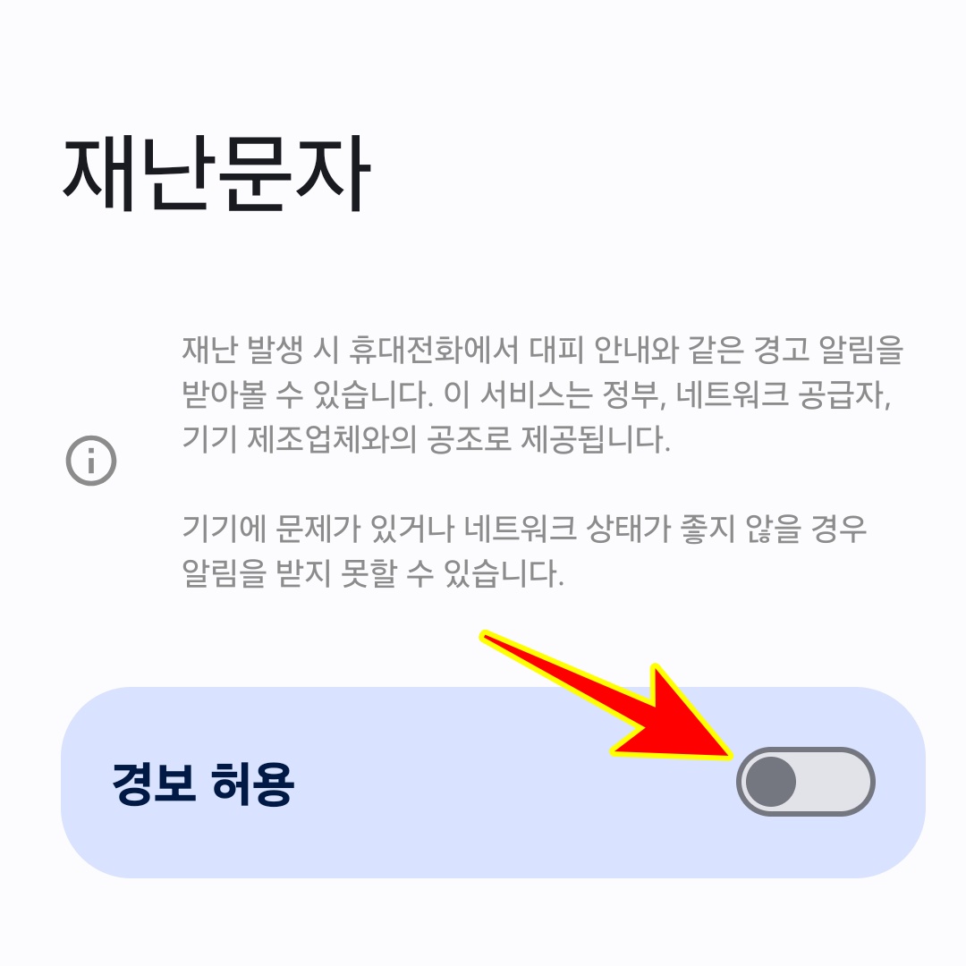 4. '경보 허용'을 비활성화하면 모든 재난문자가 차단됩니다
