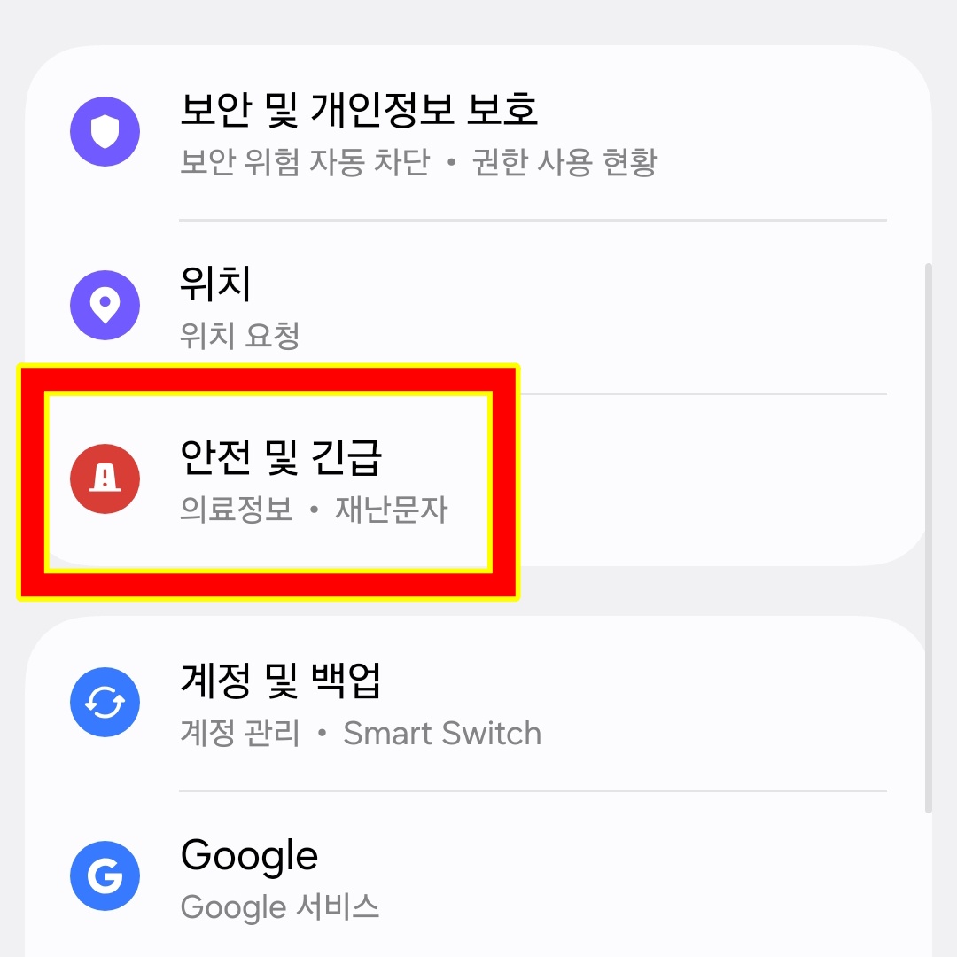 2. '안전 및 긴급' 메뉴를 선택합니다