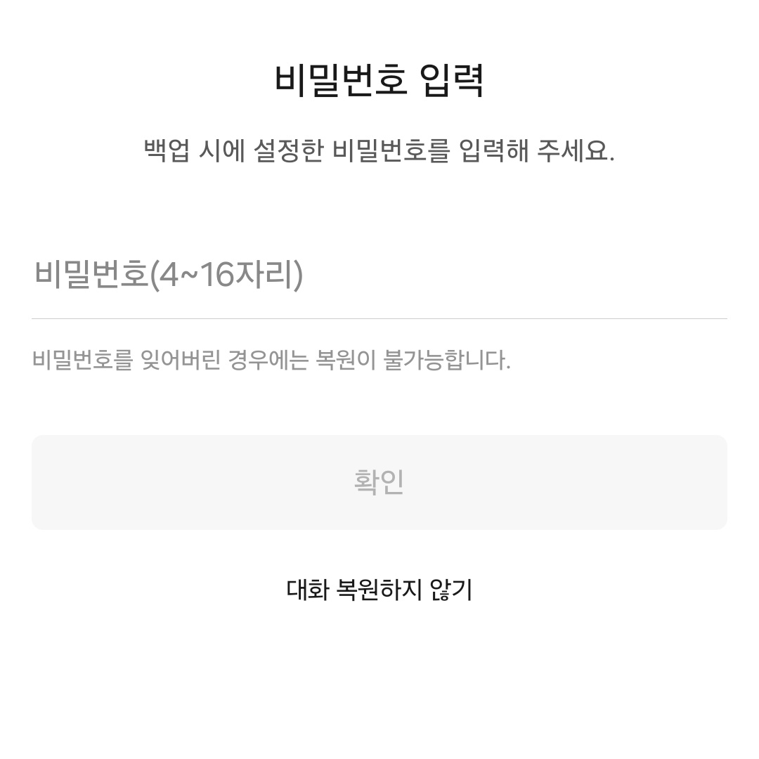 A. 새 기기에서 카카오 계정으로 로그인 후, 대화 복원 알림이 뜨면 비밀번호 입력 후 복원합니다.