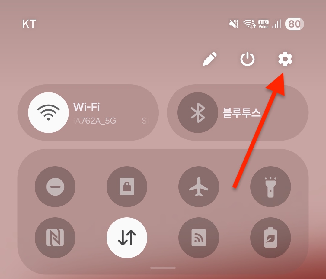 - 휴대폰 화면 상단을 아래로 스와이프하여 설정(톱니바퀴) 아이콘 선택