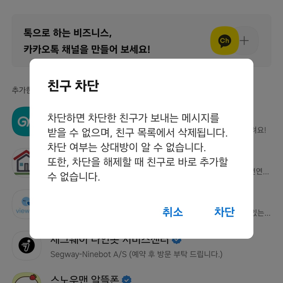 채널을 차단하면 해당 채널에서 오는 모든 메시지를 받지 않게 되고, 채널이 친구 목록에서 완전히 사라집니다. 차단 사실은 상대방이 알 수 없으므로 걱정하지 마세요.