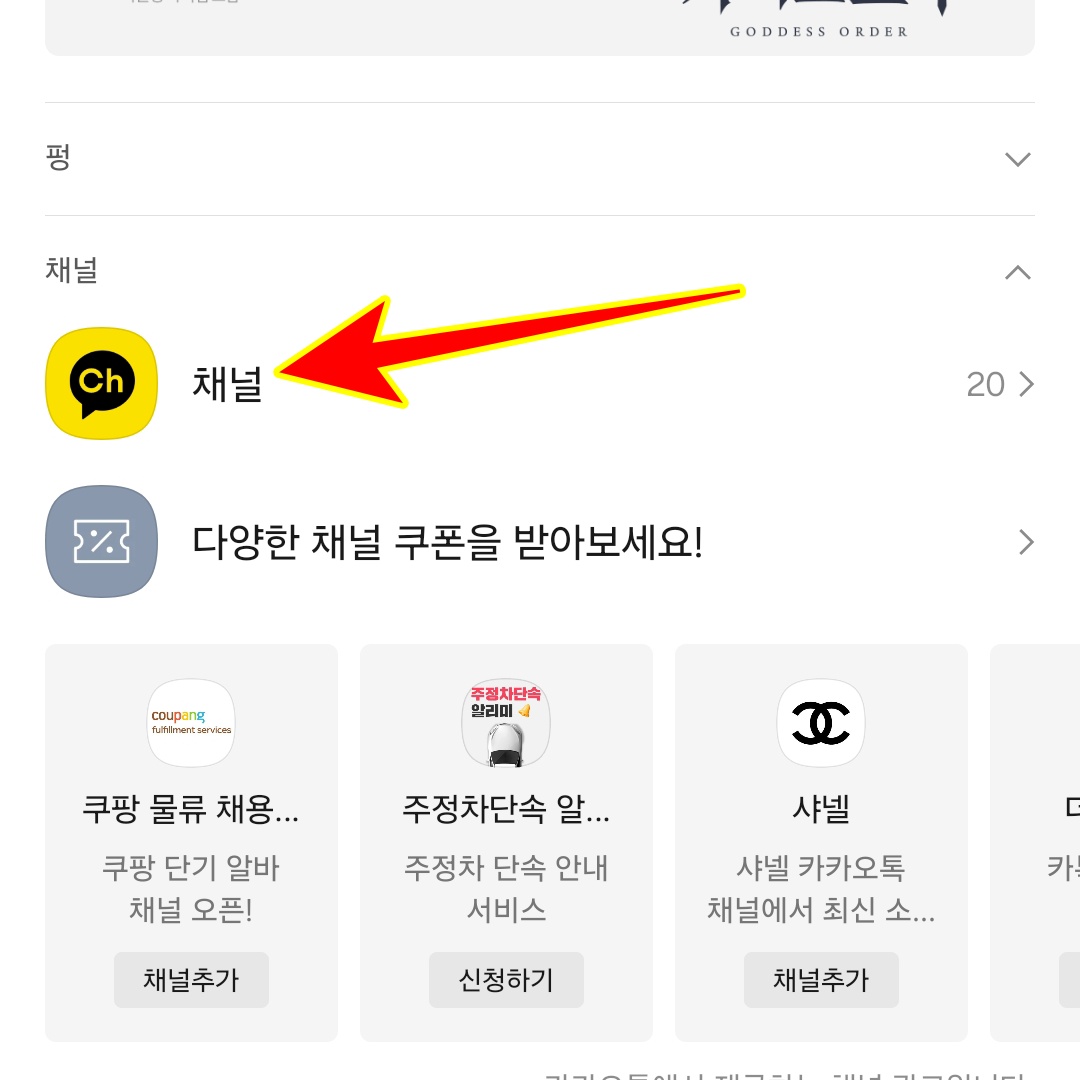 3. 화면 중앙에 있는 '채널' 영역을 클릭합니다