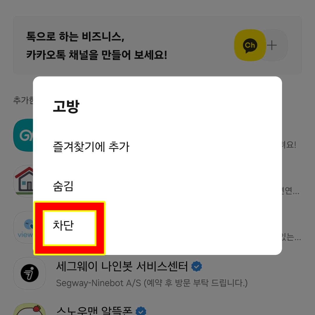 A: 차단 방법은 동일합니다. 다만 공식 브랜드 채널의 경우 유용한 정보도 많으니 알림 설정만 조정하는 것도 고려해보세요.