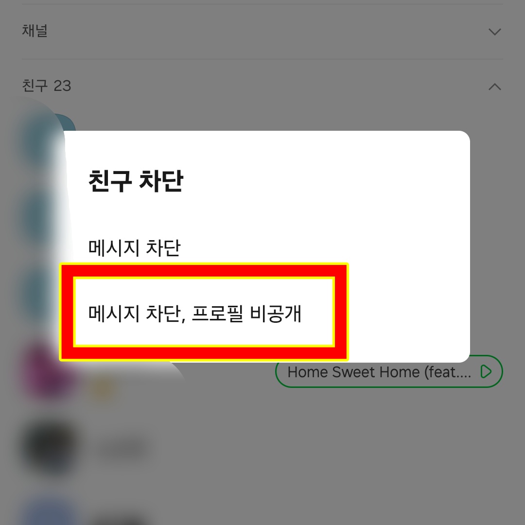 - 드롭다운 메뉴에서 '친구 차단'을 터치합니다
