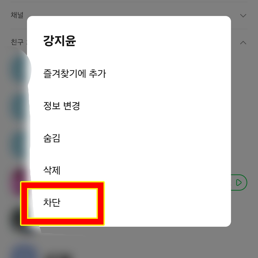 - 나타나는 메뉴에서 맨 아래 '차단' 버튼을 선택합니다